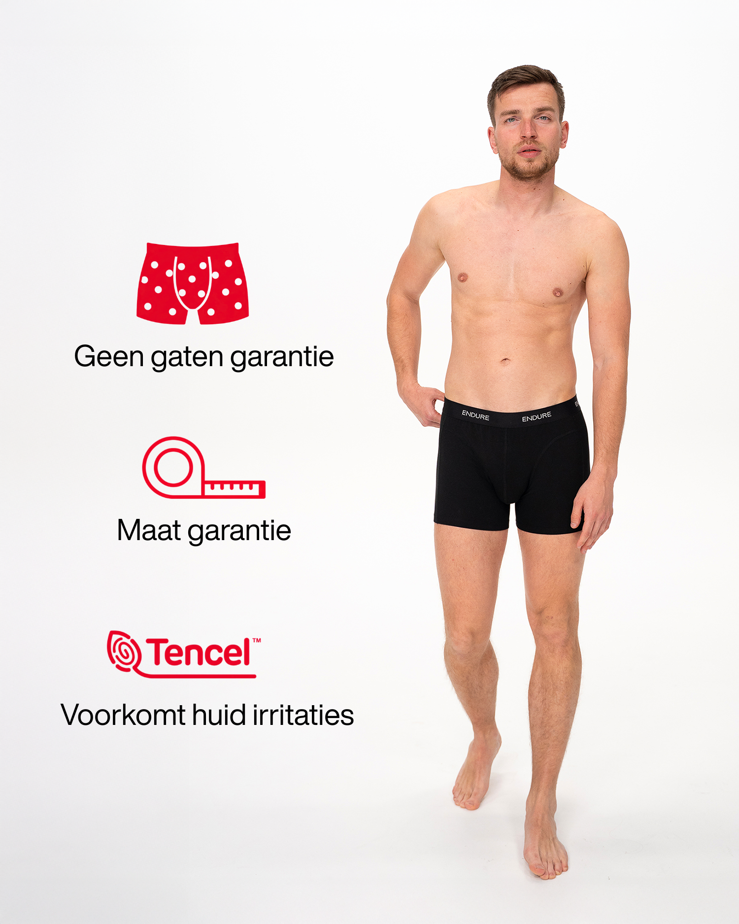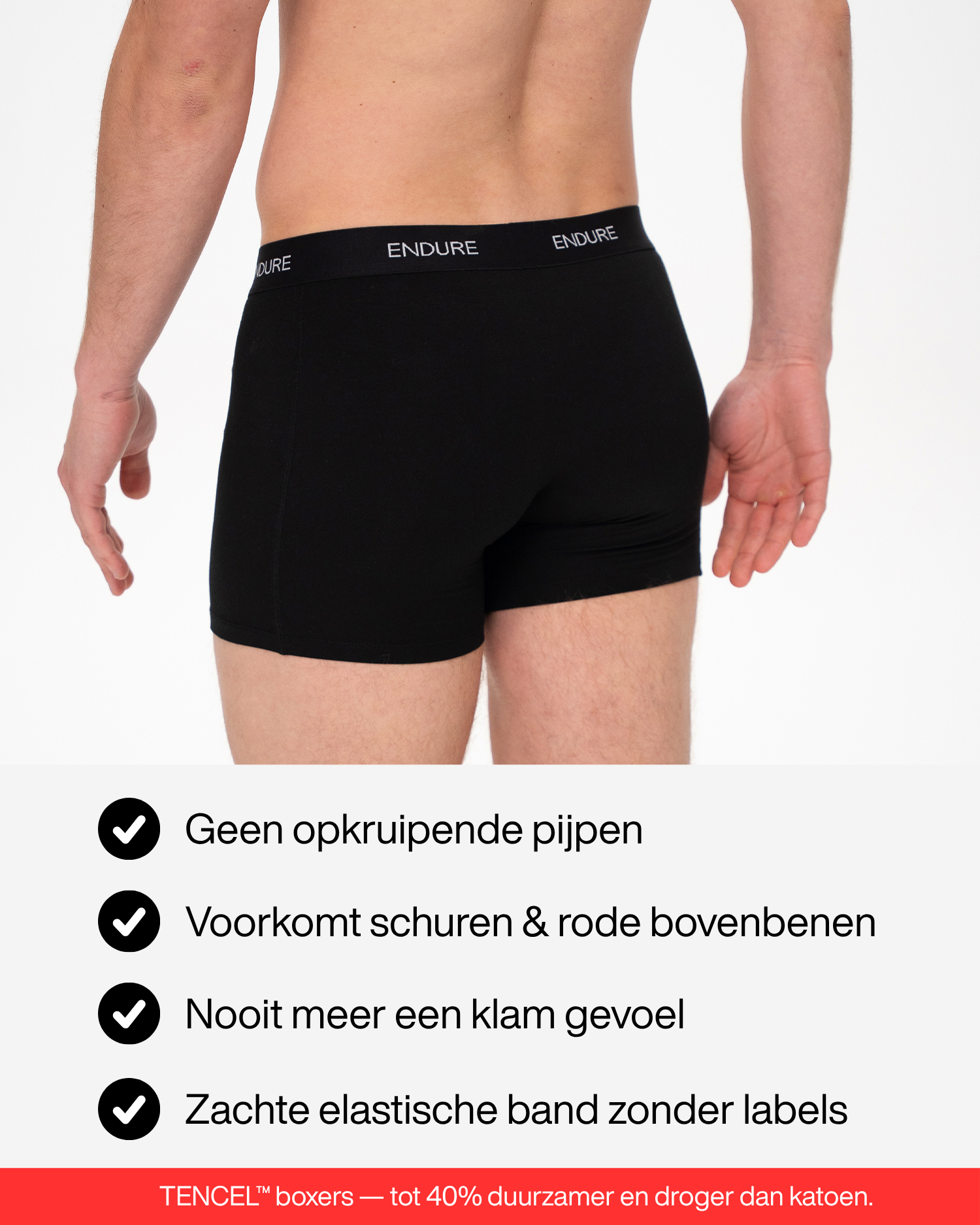Ervaar een dag zonder schurende bovenbenen, zonder opkruipende pijpen en zonder rode plekken van klam katoen. ENDUREWEAR voelt als een tweede huid—geen irritatie, geen afleiding, alleen volledige vrijheid bij elke workout en elke beweging gemaakt voor jou.