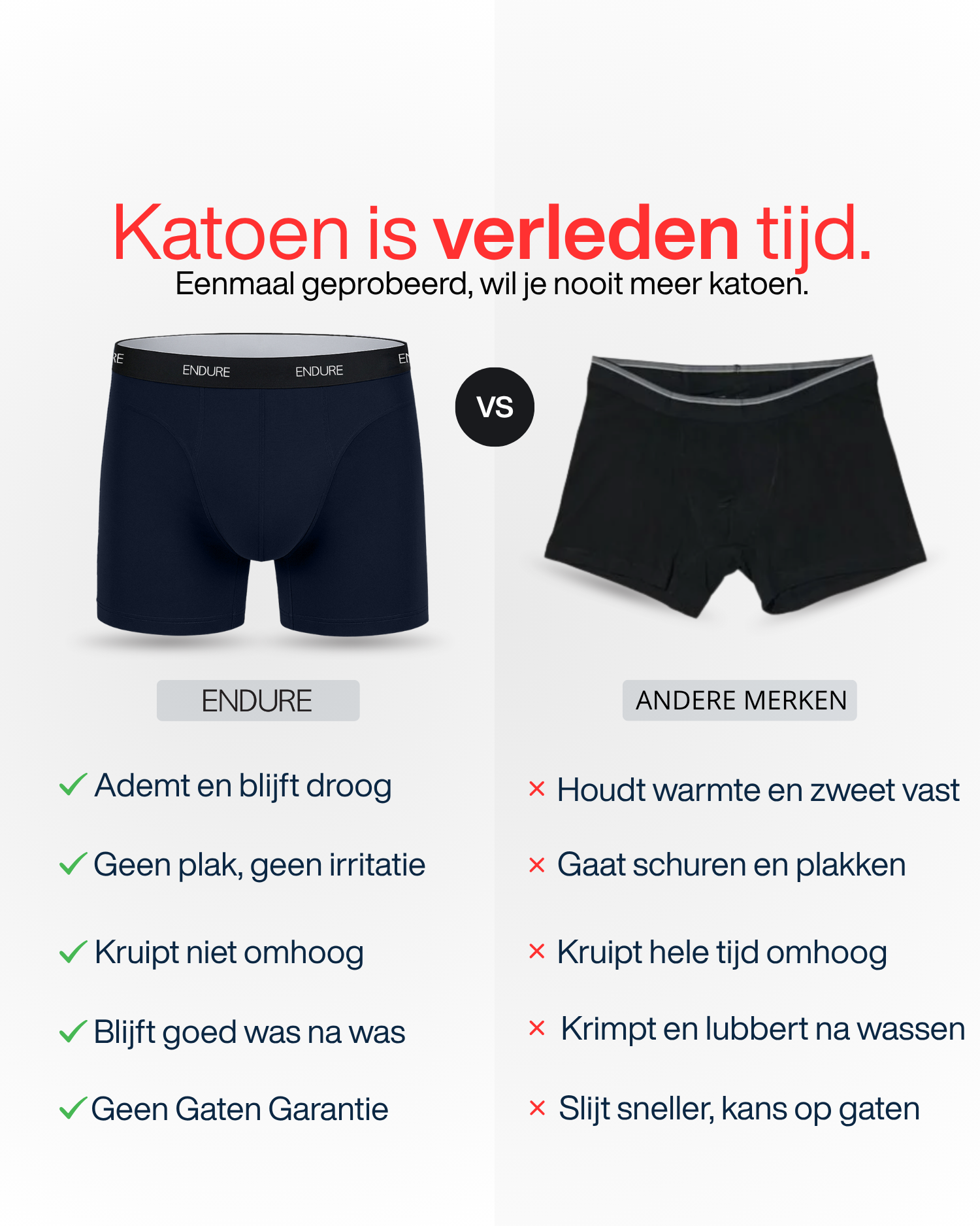 Ervaar een dag zonder schurende bovenbenen, zonder opkruipende pijpen en zonder rode plekken van klam katoen. ENDUREWEAR voelt als een tweede huid—geen irritatie, geen afleiding, alleen volledige vrijheid bij elke workout en elke beweging gemaakt voor jou.